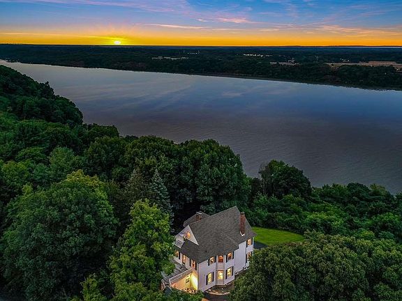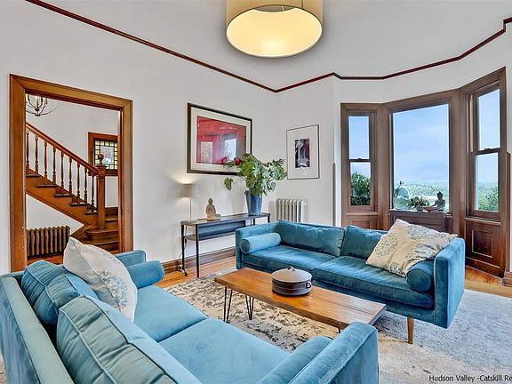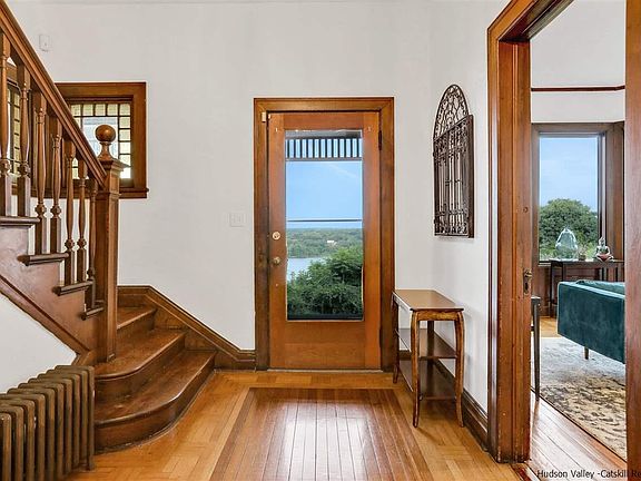 A quiet and vibrant region with magnificent scenery, cultural treasures, farm-to-table cuisine, a robust art and music scene and epic outdoor adventures, The Hudson Valley was named the Top 20 Best of the World Destinations. This is a rare and unbelievable opportunity to own a piece of history. Set on the west banks of the Hudson River, a picturesque tree-lined driveway will lead you to this truly stunning Victorian-style home. A dramatic ten-mile view of the Hudson River offers complete privacy and seclusion, yet with the conveniences you are seeking in a full-time or weekend residence, just minutes from the award-winning Buttermilk Falls and Spa, MetroNorth and NYS Thruway, and 90-miles north of Manhattan. This 4.8-acre estate features with a sprawling manicured lawn, a custom fire-pit area, golf putting green, two-car detached garage, a two-story antique barn with a lofted second story, and an insatiable inground salt-water pool. Hike at the John Burroughs Nature Preserve and Black Creek Preserve, Minnewaska State Park and the world-renowned Mohonk Preserve in the Shawangunk range is nearby offering hiking and rock climbing. Summers bring a variety of songbirds; bald eagles soar past daily year-round; Hudson River wildlife is in abundance. This truly breathtaking home features an open concept design with spacious living spaces, sun-drenched natural light, clean lines and dramatic custom woodworking. Four bedrooms, four full bathrooms, a work-from-home office/library space, a third-floor walk-up finished attic with a bonus room and artist space, and a wrap-around covered front porch with dramatic views, Pristine and updated throughout, this home is an inspiring masterpiece. Enjoy the updated primary bedroom suite with a gorgeous custom full bathroom, ample guest space, a dining room designed for entertaining family from near and far, a multitude of sprawling living space ideal for relaxation, two staircases, and unlimited potential for additional living quarters. Some recent improvements to the property include the transition to a fossil fuel free home, environmentally friendly mini-splits replaced the oil dependent boiler. Nothing left to do here but relax and embrace the simplicity of life in the Hudson Valley.