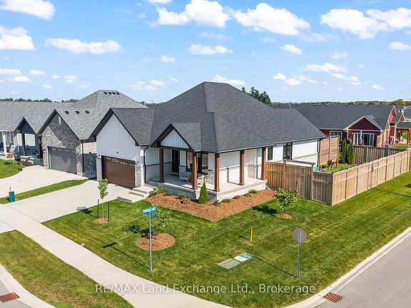 Welcome to 29 Westlinks Drive, a timeless bungalow that blends custom finishes with the lifestyle you've been looking for. Set on a landscaped and fully fenced corner lot with a charming wrap-around porch, this 4 year old Snyder built home offers 1,740 sqft of thoughtfully designed main floor living. Inside, the open concept layout is bright and inviting, with cathedral ceilings, a gas fireplace flanked by built-in bookcases, and expansive windows that flood the space with natural light. The living room, dining room, and primary bedroom are all equipped with mechanical blinds, adding modern convenience. The kitchen is a showpiece with custom white cabinetry to the ceiling, high-end appliances; including a gas range, a sleek black granite sink, light oak island, and seamless flow into the dining and living areas, perfect for family life and entertaining. Patio doors open to a spacious deck with room for both dining and lounging, extending your living space outdoors.The main floor features three bedrooms, each with professionally installed built-in closet organizers. The primary suite offers a spa-like ensuite with double sinks and a stunning tiled shower, while the main five-piece bath includes double sinks, quartz counters, and a tiled tub/shower combo. Light oak hardwood runs through the principal spaces. The mudroom/laundry offers custom built-ins and a bench for everyday convenience. Downstairs, the oak staircase leads to a partially finished basement with one completed bedroom and two more awaiting your finishing touches. Drywall and electrical are already in place, making it easy to create a large family or recreation area. Curb appeal is unmatched with white board-and-batten siding, stone accents, and black-trimmed windows. Life at Westlinks means more than a home, it's a community. Your membership includes access to the golf course, tennis/pickleball courts, and a fitness center. A rare opportunity to own a custom home in a vibrant setting.