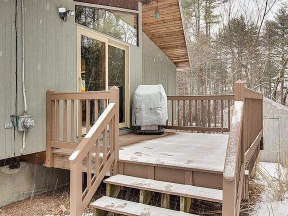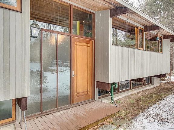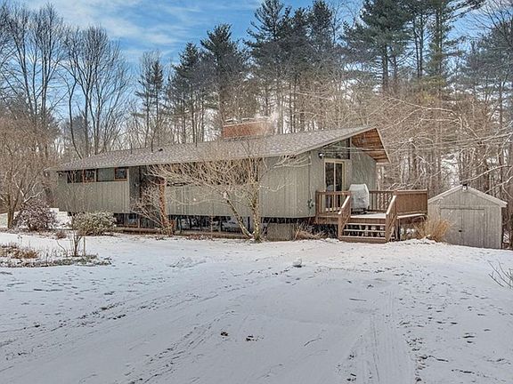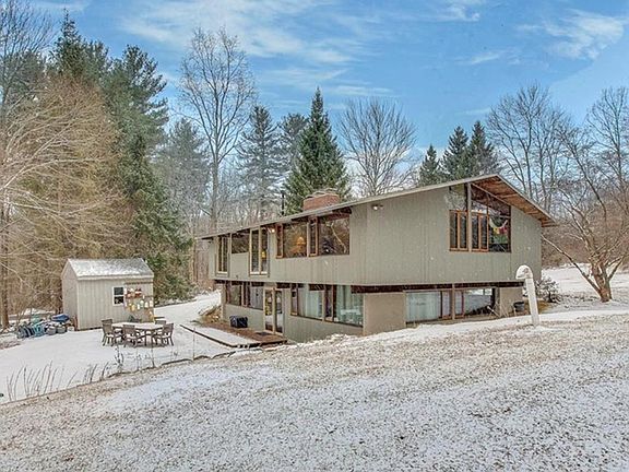 Welcome to this classic four bedroom contemporary "Deck House" loaded with warmth and charm, tucked back from a pretty country road. Gorgeous corner lot has great open spaces for play yard, outdoor living and gardening. Enjoy the open floor plan with soaring cathedral wood ceilings, brick wood burning fireplace, pellet stove and gleaming wood floors. First level enjoys comfortable, updated, eat-in kitchen with granite counters, pantry, ample work space and picture windows overlooking expansive front yard. The living room includes raised hearth brick fireplace, hardwood floors and walls of windows w/lovely views. Two bright bedrooms and full tile bath complete the 1st level. Lower level has wood floors, large family room w/brick fireplace, two bedrooms and full tile bath. Many important features include walk out to patio and large storage building, newer septic system, Buderas boiler, stainless hot water heater and sweeping circular driveway, sited off picturesque cul-de-sac.
