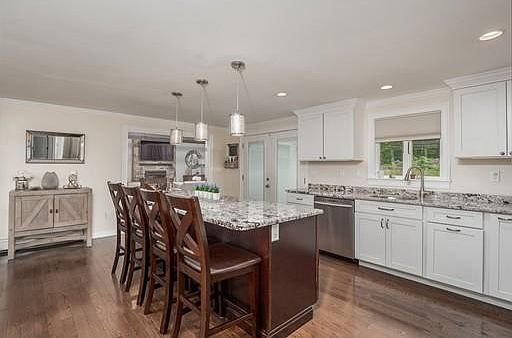 - Kit Dscrp: Flooring - Hardwood, Countertops - Stone/Granite/Solid, Deck - Exterior, Kitchen Island, Stainless Steel Appliances, Open Floor Plan, Recessed Lighting, Gas Stove, Lighting - Pendant