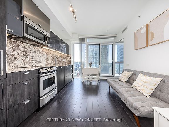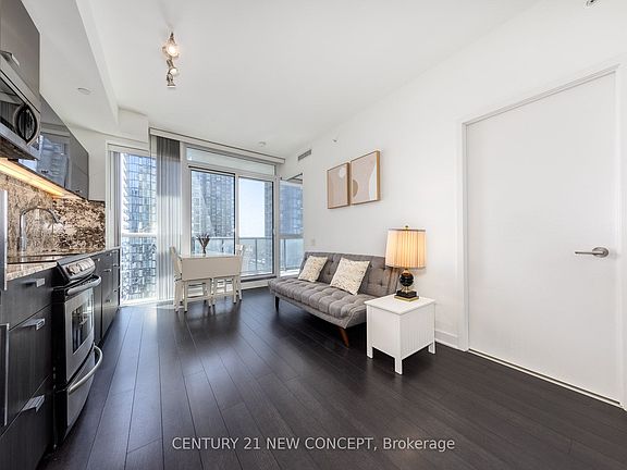 Welcome to The Bond Condos - where luxury meets the vibrant heart of Toronto's Entertainment District. This beautiful west-facing one-bedroom suite sits high above the city, offering breathtaking views of the skyline and Lake Ontario. With 9-foot ceilings and floor-to-ceiling windows, the space is filled with natural light. The 104 sq. ft. balcony is perfect for enjoying fresh air and open views. Inside, the smart open-concept layout features a modern kitchen with built-in stainless steel appliances, sleek countertops, and contemporary cabinetry. The designer bathroom and stylish finishes make this home ideal for professionals, first-time buyers, or investors. Residents enjoy resort-style amenities including a rooftop pool and hot tub, full gym, yoga studio, golf simulator, games and billiards rooms, party room, and rooftop terrace with BBQs and lounge areas. The building offers 24-hour concierge service, automatic entry doors, and a secure environment. Located steps from top dining, shopping, theatres, and major attractions like the TIFF Bell Lightbox, CN Tower, Rogers Centre, and Scotiabank Arena. With a 100 Walk Score, 100 Transit Score, and 97 Bike Score, convenience is unmatched.