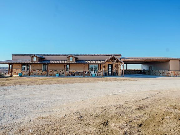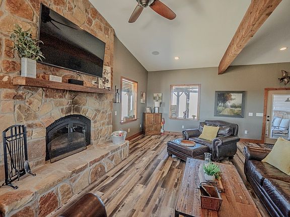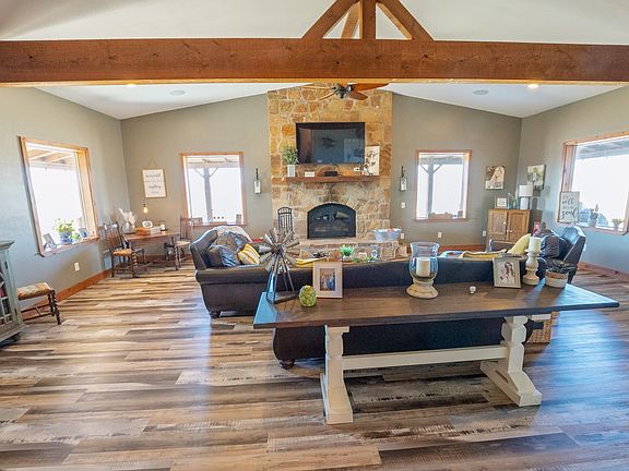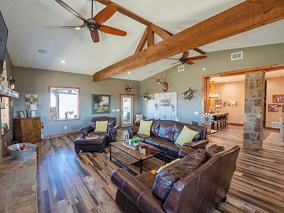 Welcome to 30 acres offering privacy, functionality, and peaceful country living that’s hard to find. A long private driveway creates a quiet retreat tucked away from the main road. This 3-bedroom, 3-bath home is thoughtfully designed for both everyday comfort and entertaining. The spacious family room is anchored by a dramatic floor-to-ceiling fireplace, creating warmth and ambiance throughout the home. Natural light fills the living spaces, enhancing the open and inviting feel with the oversize windows. The kitchen is a true centerpiece, featuring cabinetry that extends to the ceiling, beautiful granite countertops, a gas range with double ovens, and abundant prep and storage space. Just off the kitchen, a dedicated coffee bar and second refrigerator area add extra convenience and make entertaining effortless. The spacious dining room, makes it perfect for holidays and family celebrations. The oversized primary suite is a private retreat with its own sitting area and a secluded in-suite office. The ensuite bath offers separate vanities, an expansive double shower, and spacious walk-in closets designed for organization and comfort. The second bedroom also includes a private ensuite bath, walk-in closet, and an additional flex space that can serve as a nursery, reading nook, playroom, or secondary office. The large utility room is equipped with built-in storage, and counter space, making daily tasks more efficient and organized. Outdoors, the property truly shines. A 40x60 enclosed metal shop provides exceptional workspace or storage, complemented by a 40x30 covered carport and a separate 40x30 area with horse stalls, making this property ideal for equestrian use, or hobbies. The wraparound porch and outdoor cooking area create the perfect setting to unwind, entertain, and take in breathtaking sunsets and you will appreciate frequent sightings of deer and other native game on the property. Schedule your private showing and experience it for yourself.