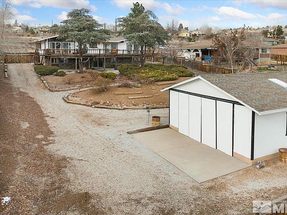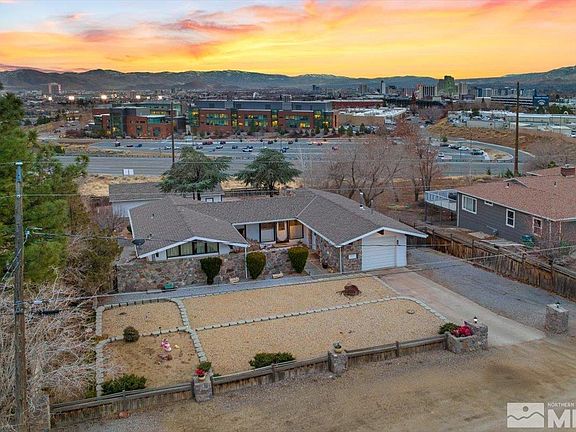PRICE REDUCTION. Contractors Dream with Colossal 1152sq/ft heated garage/workshop accommodates 6 plus cars, RV, Boat and toys. Home featuring 4 Bed, 2 Bath and a finished basement with bonus room. Abundance of natural light stream through the panoramic windows that frame Downtown Reno, UNR and beautiful mountain ranges that can also be viewed from your amazing 1100sq/ft deck. Two wood burning fireplaces and an attached garage complete the upper property., Courtyard entry way and fully xeriscape front and back yard that is only 5 minutes from UNR and downtown. City water and huge 2500 gallon septic system on 1/2 acre lot.