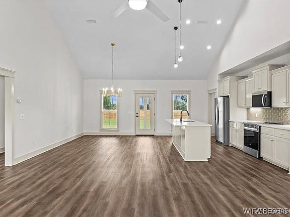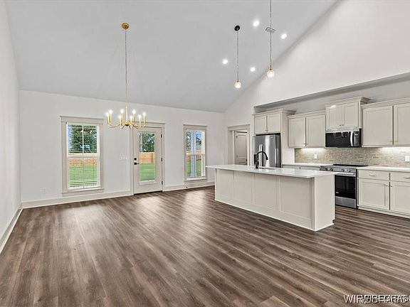 Inside, you’ll find soaring ceilings, abundant natural light, and beautiful luxury vinyl plank flooring that flow seamlessly throughout. The open-concept kitchen boasts quartz countertops, custom cabinetry, a spacious island with a deep sink, stainless steel appliances, and a sleek tile backsplash — perfect for both everyday living and entertaining.