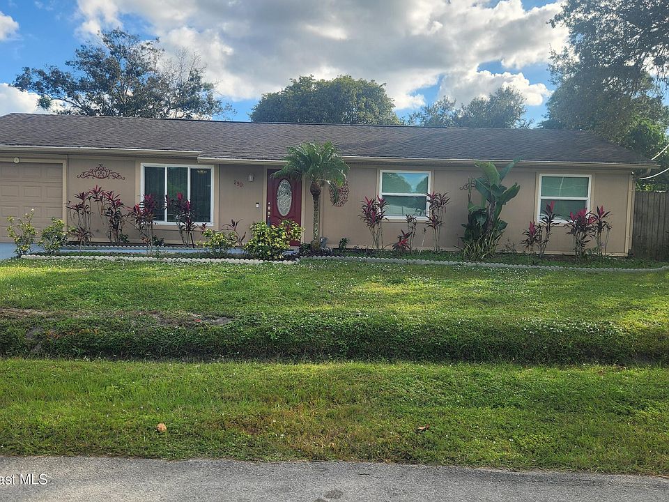 Well-maintained home on a spacious corner lot located in Southeast Palm Bay. Features include hardwood cabinets, granite countertops, marbleized backsplash, stainless-steel appliances, Strom windows 2019, Night owl security system, newer AC, roof, and water heater. Enjoy two patios (one covered), a large shed, and a fenced in yard. Move-in ready and won't last long!