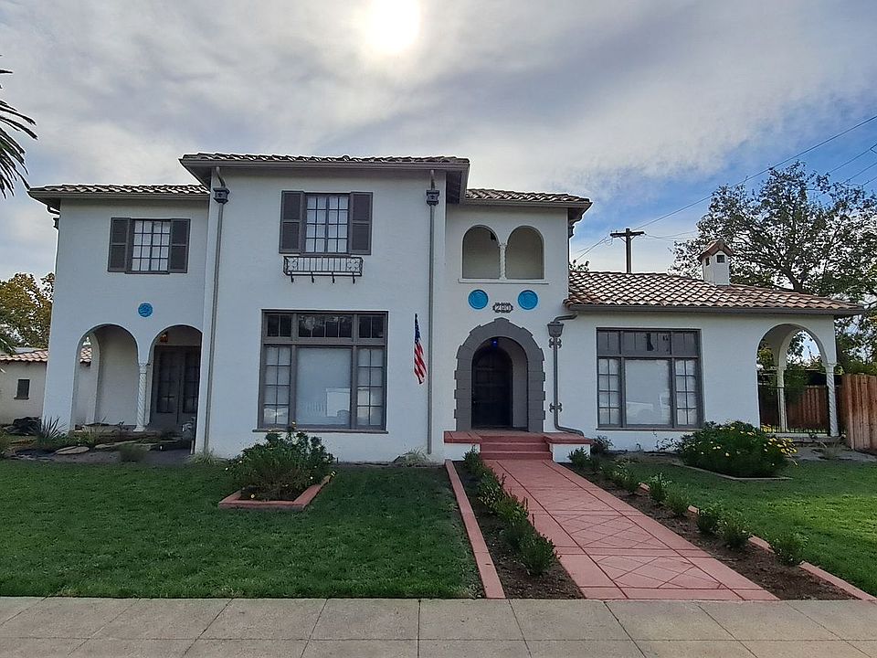 This stunning 1929 Spanish-style two-story luxury home seamlessly blends historic charm with modern elegance. Featuring 4 bedrooms and 3.5 bathrooms, the residence showcases classic Mediterranean architecture with white stucco walls, a terracotta tile roof, and graceful arched entryways. The beautifully landscaped front yard includes lush green lawn, steppingstone pathways, and mature palm trees that enhance the home's striking curb appeal.