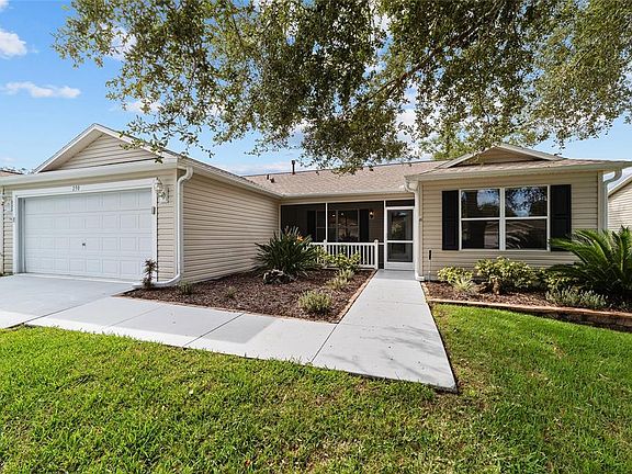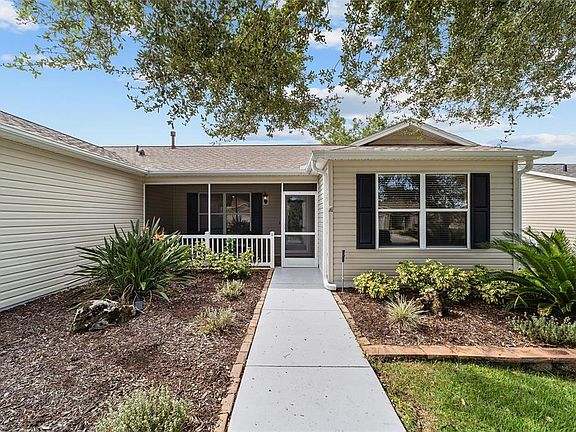 Located in the highly desirable Village of Caroline, this well-maintained Amarillo model offers 1,527 sq. ft. of heated living space and a convenient central location near Lake Sumter Landing. Built in 2006 with a low remaining bond of just $6,134.43, this home has been thoughtfully updated for peace of mind, including a new roof (2021) and HVAC system (2016). An aluminum pergola added in 2021 enhances the outdoor living space, perfect for relaxing or entertaining year-round. The popular split-bedroom floor plan features an open and airy design with a spacious great room that flows seamlessly into the dining area and kitchen. The kitchen offers generous cabinetry, ample counter space and is filled with natural light. The primary suite includes 2 walk-in closets and private bath, while the guest wing provides comfortable accommodations for visitors. Enjoy Florida living on the enclosed lanai and pergola-covered patio, overlooking a beautifully landscaped yard that enhances curb appeal. The two-car garage provides additional storage and functionality. Situated close to Lake Sumter Landing Market Square, multiple championship golf courses, and recreation centers, this home offers both comfort and convenience. With major updates already completed, this Amarillo model is move-in ready and positioned in one of the most sought-after Villages locations.