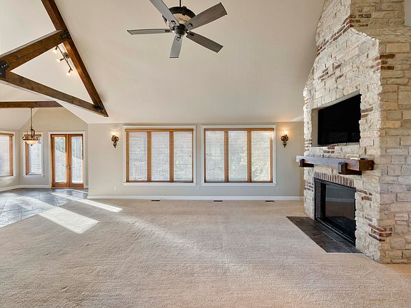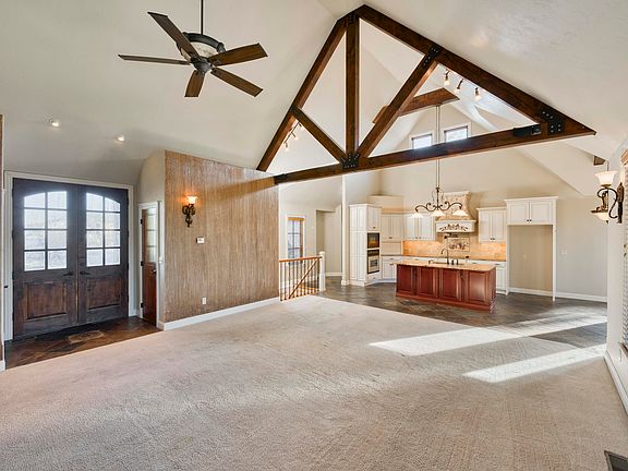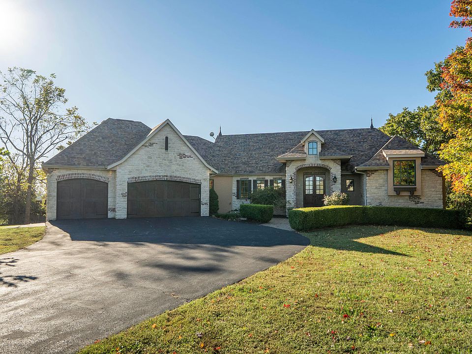 Custom-designed French Country home! This classic home is located just one mile from Table Rock Lake on 5+acres, beautifully designed with custom upgrades, tile, and solid wood doors throughout. Open floor plan w/vaulted ceilings & wood beams. The custom kitchen has granite counters, tile backsplash, walk-in pantry, and a deck overlooking your secluded backyard. Large windows throughout w/wooden blinds. Laundry, gorgeous master BR with dual sinks, jetted tub, shower & large walk-in closet on the main floor. Lower level has 2 BR & 1 -1/2 baths w/family room, sunroom, large tool/work room & even more storage! Three-car garage for extra space & storage. Just down the road from Table Rock Lake and park where you can launch your boat, fish, camp, swim or just take a nice walk. Gorgeous landscaped yard with sprinkler system. Roof and exterior paint were just replaced in the last three years. Shed is included. Many other extras! Don't pass this one by!