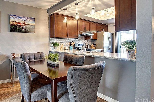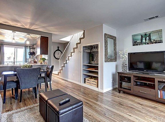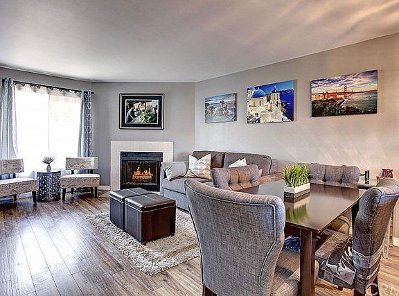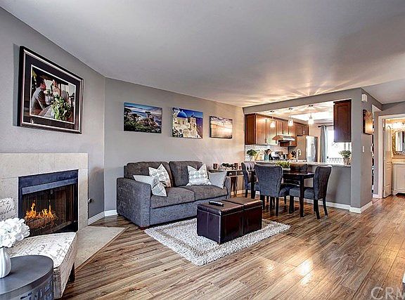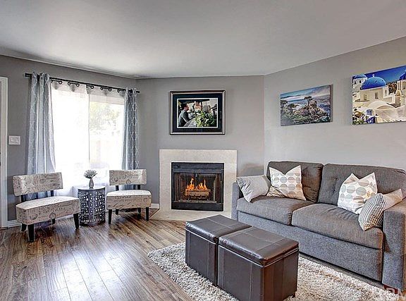 Feels like a brand new home! No details are spared in this recently remodeled home! The open floor plan lends itself to modern, casual living and is complemented with wood laminate flooring with a look of weathered driftwood, wide baseboards, smooth ceilings, interior doors, upgraded windows, designer inspired paint scheme and a travertine faced gas fireplace. The kitchen is well appointed with a generous amount of quartz countertops and breakfast bar, custom wood cabinetry with soft close doors, stainless appliances, including the counter depth fridge, custom lighting, and stainless fixtures. The kitchen has a private balcony accessed through the sliding door. The guest bath is upgraded with a Carrera topped wood vanity and framed mirror. Upstairs are two generous sized bedrooms, each with its own bath, ensuite. Both bathrooms are upgraded with modern tile floors, newly tiled tub and showers both with a shampoo niche, frameless glass doors, and solid surface vanity. The bedrooms have ceiling fans and wood blinds covering the upgraded windows and plush carpet. There's a one car garage and private laundry, as well. It sits at the back of this small, well located enclave with a Walkscore of 70! Close to beaches, 17th St shopping and Triangle Square.