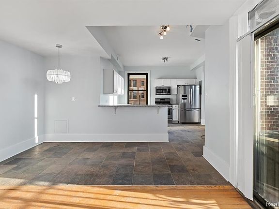 Albert Kahn condo with fantastic views on Detroit East Riverfront! The Garden Court Condominium building sits minutes from Downtown Detroit, on the East Riverfront with views of Belle Isle, the Detroit River and downtown skyline. This century-old brick & stone building maintained its prewar charms while offering modern amenities such as central heating & cooling, open floorplans and a community rooftop terrace. Unit A600 is located on the 7th floor of the building; with windows on 3 sides, it allows each room to have a different stunning panoramic view. The original wood floors have been preserved through all main rooms, while the kitchen and the bathrooms feature slate tile and original hexagonal tile (respectively). The floorplan starts with a massive open kitchen, dining and living space at the West side of the unit that opens to a small terrace with Downtown views. The bedrooms are placed on each side of the hallway, with a primary suite on one side and an elegant bedroom with bay windows on the other. In the large foyer, the original wall moldings (base, crown and wainscot), new lighting and original wood floors are sure to stun your guests! Recent upgrades include: new paint, new light fixtures, new vanities & mirrors, tub reglazed.