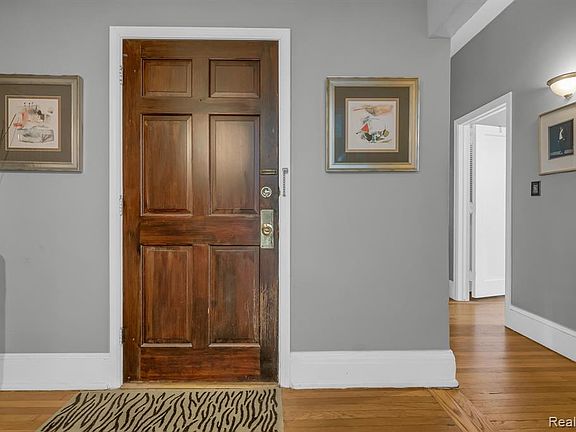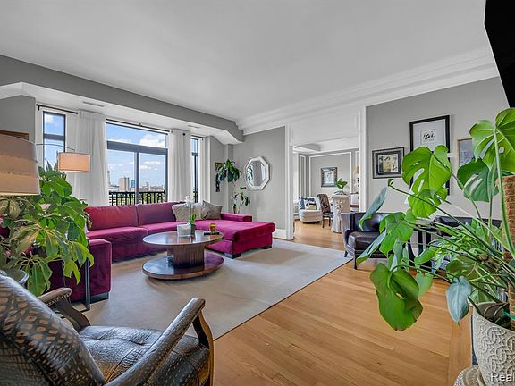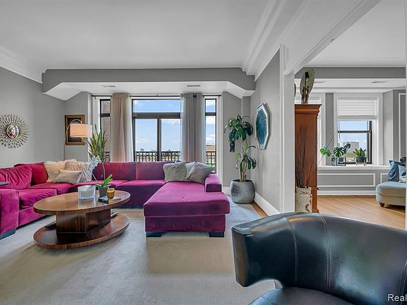 Welcome to a timeless 7th-floor residence in one of Detroit's most iconic buildings the Albert Kahn-designed Garden Court Condominiums, built in 1917. This spacious 2-bedroom, 1-bath home blends historic charm with modern updates and jaw-dropping skyline views that stretch from Downtown to the riverfront. Inside, original architectural detailing is elevated by tall ceilings, rich moldings, and beautifully preserved hardwood floors. The grand living room centers around a classic fireplace and flows seamlessly into an oversized formal dining room perfect for entertaining or quiet evenings in. Natural light pours in through oversized windows, framing sweeping views of the Detroit River and city skyline. The kitchen is thoughtfully updated with sleek cabinetry, stone countertops, stainless steel appliances, and a stylish tile backsplash, while the bath features vintage hex tile, pedestal sink, and soft natural light. Residents enjoy the rare benefit of in-unit laundry, a private balcony, and ample closet space, as well as access to a common rooftop deck and secure, gated parking (one space included; additional spaces available for rent). Storage unit included. This is a truly special rental opportunity stately, light-filled, and centrally located just minutes from the RiverWalk, Belle Isle, and downtown's best dining and cultural destinations.