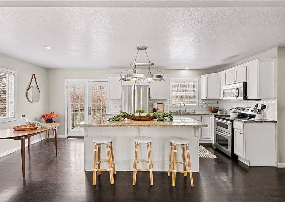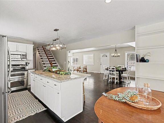 Don’t miss this 4 bedroom, 2 ½ bath, 1-car garage open concept two-story home in South KC. This recently updated home is just over 2200 sq feet and move-in ready! Walk into a bright and open living,dining and kitchen area featuring gleaming hardwood floors. The open concept kitchen features a spacious island with granite countertops providing a gathering place perfect for entertaining guests. Enjoy the French doors off the kitchen leading out to the back deck surrounded by green space creating a private oasis perfect for relaxing or hosting outdoor gatherings. The laundry room is conveniently located on the main level! The Primary suite serves as a private retreat with hardwood floors, a ceiling fan, and an ensuite bath featuring ceramic tile floors, an updated vanity and a walk-in shower. Three additional bedrooms, all featuring hardwood floors, are open and bright, sharing a hall bath with a shower-over-tub, ceramic tile walls and flooring, and a classic pedestal sink. For convenience in any weather, the basement includes an inside entrance and provides space for family room, home office, game room or plenty of extra storage. The home has NEW EXTERIOR PAINT providing the buyer peace of mind for exterior maintenance, Enjoy the oversized driveway that easily accommodates guests. Prime location with. easy access to highways.