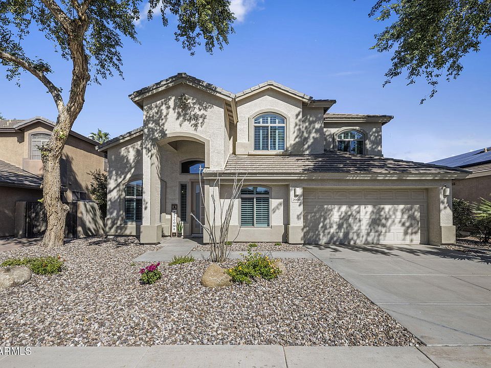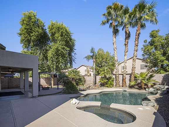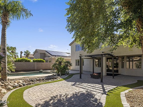 This beautiful Chandler home truly has it all — 5 bedrooms plus an office, an open and spacious floor plan, and stylish luxury vinyl flooring that adds a modern touch. The primary suite is conveniently located downstairs, featuring a beautifully tiled bathroom wall and a walk-in closet. Upstairs, you'll find generously sized guest rooms, giving everyone plenty of space to relax. Recent updates include two newer AC units (installed in 2022) and six new windows along the front of the home, improving both comfort and efficiency. Step outside to your own backyard retreat — complete with a covered patio, sparkling heated pool and spa, and a peaceful pond that's easy to maintain. There's even a storage shed on the side of the home for extra convenience.