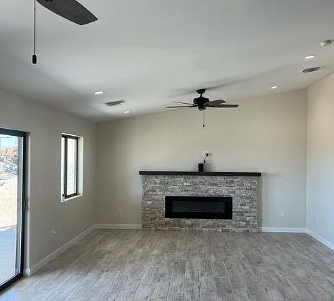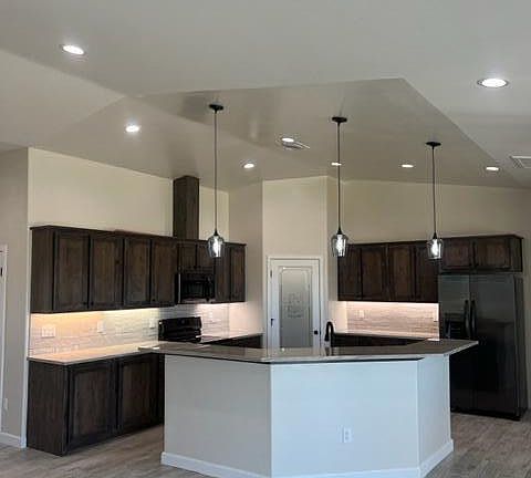 BRAND NEW CONSTRUCTION RV Garage Home. This open plan home has all the upgrades, quartzite countertops throughout, custom knotty alder solid wood cabinets, walk in pantry, black stainless (smudge resistant) appliances, including a side by side refrigerator, over the hood microwave that vents to the outside and under cabinet lighting. Electric fireplace with rock surround and wood mantle, wood look floor tile in all living areas. Upgraded carpet & pad in bedrooms. Can lights and fans in all bedrooms. Large tiled walk in shower with bench. Extra large closet in the master bedroom. Separate makeup vanity. Large linen closets in each bathroom. Epoxy floors in the garage and a large utility sink. Aquasana whole house water filtration system included. Concrete paths around the whole house. Lots of room to park on the side of house. Lake views from the backyard and patio. The whole structure has encapsulated insulation in the roof. Fully landscaped with drip system. This home is complete and move in ready.