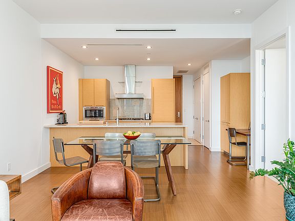 seamlessly, featuring wide-plank bamboo wood floors, soaring ceilings, and