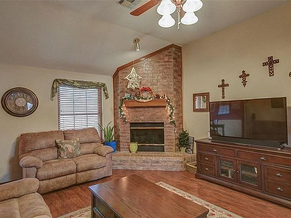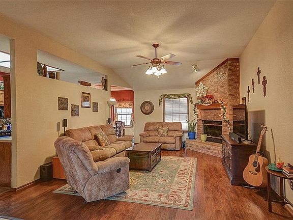 Don't miss this super nice home on a corner lot in the family-friendly Royal Oaks Addition! This home has charming curb appeal! Step into the foyer & see beautiful hand-scraped laminate wood floors in family & dining room/study. The fireplace w/ brick from floor to ceiling is a welcoming sight. The kitchen has lots of counterspace. Recently installed countertops & glass tiled backsplash compliment this pretty kitchen & kitchen cabinets have been refaced. SS appliances. Gas range new in Dec. 2017. There's ample seating room in the breakfast nook w/ bay window & additional seating at the breakfast bar. Master bedroom is separate from other bedrooms & is spacious, boasting a nice window seat. The Master bathroom has double sinks, garden tub, separate shower, and his & her closets. The back patio is perfect for backyard BBQs. Roof/gutters were new in 2015. Vinyl tilt-in windows, carpet, hardware, ceiling fans, interior paint & fence are recent updates. Sod installed in backyard Dec 28th.