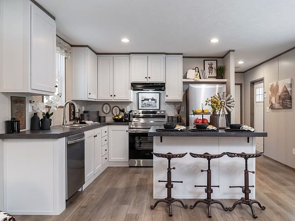 With an open-concept layout and ambient lighting, the Horizon home gr grabs your attention. The wood look linoleum flooring, cozy kitchen with new appliances, and intimate color palette helps create the feeling of the home. Neighboring to the washer and dryer, the first bedroom features an attached four-piece bathroom with a shower/tub combination and elegant finishes. On the opposite side of the home lies the second bedroom, with a nearby bathroom and equally elegant finishes. Overall, if you're looking for a bright and inviting layout and striking attention to detail, look no further than the Horizon by Clayton Homes.