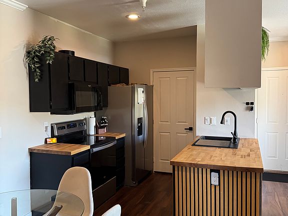 Step into the brand-new kitchen, featuring butcher block countertops, sleek black cabinetry, matching black appliances, and a stylish island with wood slat detailing. The open layout flows seamlessly into the dining and living areas, creating a warm and inviting atmosphere.