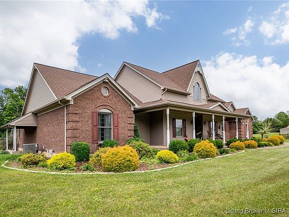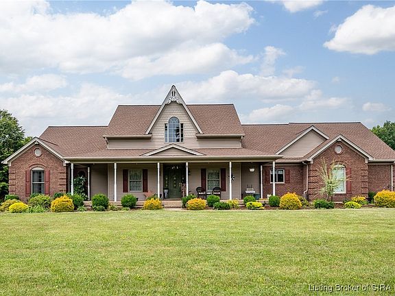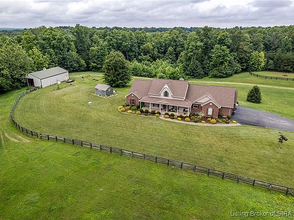 Beautiful HORSE FARM in quiet/PRIVATE setting, off the beaten path, on a dead end road... yet location has EASY ACCESS to shopping/dining & interstate. This location is halfway between Corydon & Lanesville, about 25min west of Louisville. Multiple fenced pastures w/ 4-board fencing, 40x60 barn w/ 2 stalls (room for more stalls, if needed), water/electric & plumbed for future bathroom. Smaller barn is a footprint of 48x24: consists of several small stalls, run-in, lean-to. This setting is the perfect blend of woods and pasture, with this spacious custom built home is nestled in the midst. Open layout w/ lots of natural light. The huge kitchen offers tons of cabinets, an abundance of counterspace, island, Jenn-aire cooktop & pantry. Another highlight is this primary suite! It's quite roomy & features an enormous custom shower, huge soaking tub, heated tile floor, roomy custom closet. It also exits to the covered patio and pool area. The 2nd level is one large open loft area. W/O bsmt is mostly unfinished, w/ a couple of rooms finished & a full bath (which also has a second washer/dryer hookup). The primary HVAC system is about 2yo, the secondary system is original. A BACKYARD OASIS awaits you, featuring an expansive patio area, deck and all tastefully landscaped. Cute "SHE SHED" is heated/cooled with mini-split, could make for a fun play space for kids or artist's lair. Wooded area last timbered 22yrs ago.