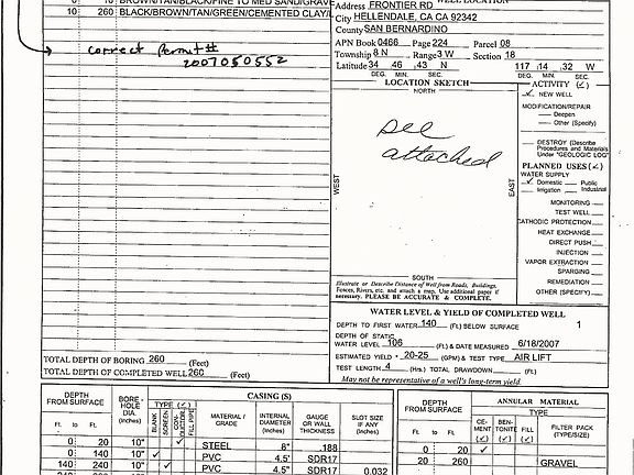 Great Homesite in Helendale, not far from Silverlakes and nearby very nice homes, spacious 2.27 Acres,APN 0466-224-08-0000, with level housepad area. Included in the price is a new/unused WATERWELL drilled in 2007 and fully permitted but not yet used. The cost of a well such as this itself alone exceeds the list price. Also included in the price are three expensive drainage-culvert pipes (pictured in the listing photos) for the partially completed driveway access. Electric is nearby on Frontier Road but not to the parcel itself.