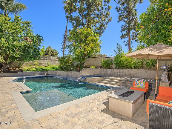 Highly desirable Morrison Ranch Estates single story pool home w/ almost 2,700 sq ft of living space! 13,000+ sq ft lot located on a double cul de sac street w/ pretty mountain views from the front. Versatile floor plan boasting 3 bedrooms, plus an office/gym off of the Master bedroom ensuite. Resort-like backyard w/ pebble tech pool/spa featuring a baja shelf, modern fire table and grassy areas for kids and pets alike! Enjoy Summertime BBQ's w/ the built-in grilling center, sitting/dining areas, w/ outdoor access to a separate pool room w/ sink, toilet and changing space. Easy indoor/outdoor living w/ bi-fold sliding glass door from main living areas. Kitchen w/ island has plenty of cabinets and lots of windows overlooking the backyard. Entertain family and friends in the spacious living room w/ vaulting ceilings, cozy fireplace and additional dining area. Master bedroom ensuite w/ two vanities, soaking tub, stall shower and access to backyard patio. Additional adjoining room can be used as an office, nursery, gym or ?? Other features of this home include: wood/wood-like flooring, family room w/ fireplace, citrus trees, attached two car garage, indoor laundry room w/ an additional room for storage. Low HOA dues and conveniently located near award winning Las Virgenes schools, parks, restaurants, freeway and shopping!
