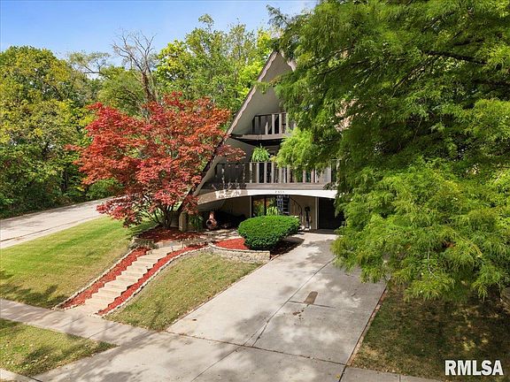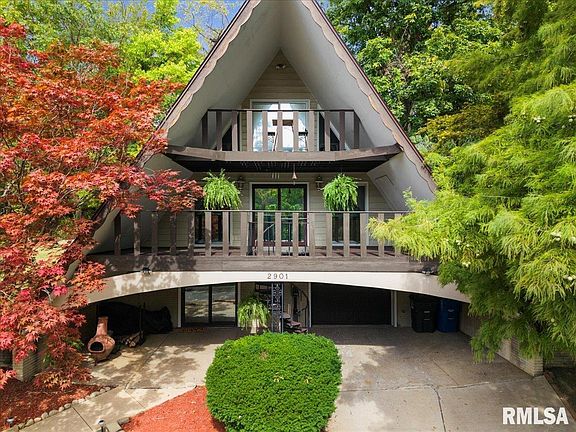 4 beds & 2 baths never looked so cool! This architecturally striking A-frame in Moline sits on a corner lot framed by mature trees & 2 elevated decks. Enter from ground level or via an exterior spiral staircase that rises to the main-floor deck. Inside, a dramatic great room soars to the upper ceiling line, anchored by a wood burning fireplace & a wall of windows. A dining area sits to the side with the kitchen nearby. 2 bedrooms & a full bath complete the main level. Above, an open bridge-style landing leads to the primary bedroom & 2nd full bath, plus access to a 2nd front-facing deck. The basement features a family room with a 2nd wood burning fireplace & a 4th (nonconforming) bedroom. Laundry is on the main level with additional hookups in the basement. The basement was waterproofed by the previous owner. Notable updates include a 2023 water heater & a 2025 main-floor toilet. The shed & all appliances stay. See this standout A-frame today!