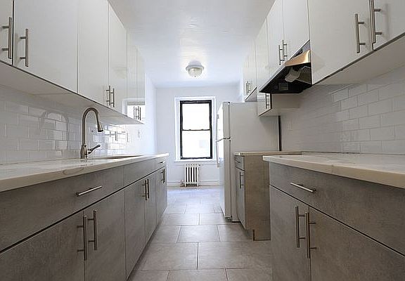 This one bedroom is located in an elevator/laundry building on the first floor rear. Quiet section of the building. Secluded from noise. The building is well maintained with a new laundry room, elevator, camera surveillance, and the building was recently repainted. The apartment is large with all rooms leading off the foyer. There is a deep kitchen with counter space on both sides. The quartz counter is soft and compliments the cabinets nicely. The contemporary look of the two-toned kitchen is noticeable and pleasant. The living room is deep and wide. Perfect for a large living room set. The bedroom is in the back. Extra quiet section of the building. It has two closets and can easily fit a king sized bedroom set. The bathroom was recently renovated with a trim! There is a closet near the bathroom ideal for linens. Train options near are 2,5 B,Q are a bit further.