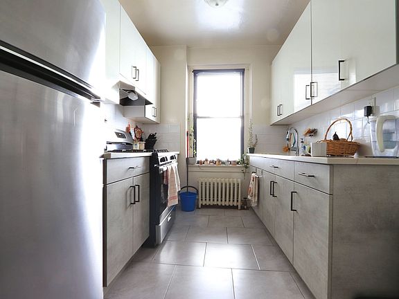 This stunning one-bedroom apartment is located on the top floor of an elevator building. The building is serviced by a live-in super. Building has an elevator and laundry. The unit has open views. It is located in the back portion of the building. Upon entering the apartment, you have a large foyer to open into your top floor oasis. There are plenty of closets throughout your home. The living room is large and can fit a large living room set. The kitchen is separated from the living room and bedroom. The kitchen was recently renovated. Stainless steel appliances match these two-toned cabinets will. The steal trim on the top cabinets gives it that touch of modern. The texture of the top cabinet is with a smooth finish and a grainy finish to the bottom. The quartz countertop is an excellent addition to this chef's kitchen. The renovated bathroom features a traditional beige tile. The bedroom is large and features two closets. This unit includes heat and hot water.