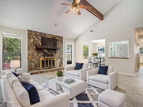 Don't Miss Out on This Modern Mid-Century Gem! Why just scroll when you could own this stunningly remodeled 3BR/2BA mid-century ranch in the heart of Stone Mountain? Every inch of this home shines with updates - from the new LVP floors to the all-white kitchen with quartz countertops, eat-at bar, and stainless steel appliances. Start your mornings in the bright bay window breakfast nook, and unwind in the vaulted living room featuring wood-beamed ceilings and a gas brick fireplace that brings instant character and warmth. The owner's suite is your private retreat with an en suite bath and walk-in closet, while two additional bedrooms and a refreshed hall bath offer space and style for everyone. Outside, enjoy your private backyard, patio, and welcoming front porch-perfect for entertaining or relaxing. Located minutes from Stone Mountain Park, local eateries, shopping, and with easy access to I-285 and Hwy 78, this home delivers both lifestyle and location. Remodeled, move-in ready, and priced to move - this is the one buyers will wish they hadn't waited on!