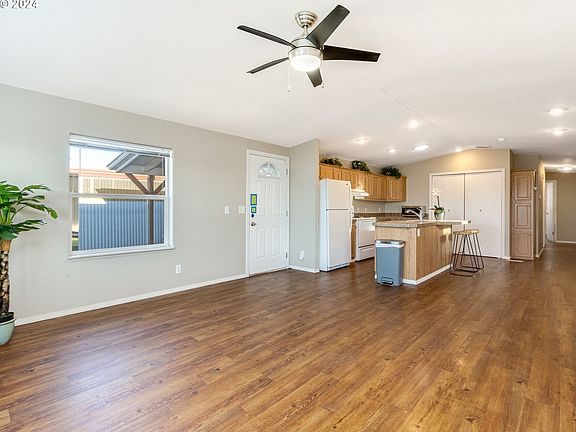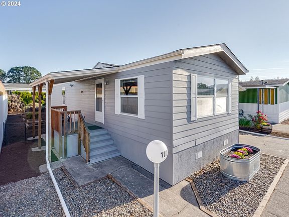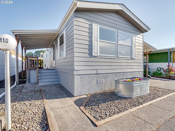 Immaculate Home in 55+ Community! This well-maintained, energy-efficient Good Cents 2008 home is located in the desirable Mountain View Mobile Park in Newberg! This home offers a peaceful setting with a space rent of $535 per month, which includes water, sewer & garbage! Featuring an open floor plan with 2 bedrooms, 1 bath, lovely kitchen with large island & tile accents plus ample pantry space adjacent to the enclosed washer and dryer. Beautiful laminate flooring throughout, with a walk-in shower in the bathroom. The living space is enhanced by vaulted ceilings, ceiling fans & solar tubes that draw in the natural light. Included with the home is a window AC unit, portable standing AC unit, stacking washer & dryer, and refrigerator with ice maker. Exterior features include cement fiber siding, vinyl windows & outdoor living spaces. The front porch has covered Trex-decking and back porch with covered patio, lighting & built-in skylights. The yard is amply sized & fully fenced with raised garden beds & refreshed bark dust. Includes a generous outside workshop with electrical outlets & lighting that provides plenty of space for tools, projects & storage! Just steps away is the clubhouse/common area, which is divided into two rooms: one for meetings & entertaining, and the other as a game room. Additionally, the mailboxes, garbage bins & recycling are located conveniently nearby this home, just a short walk for easy access. This home checks all the boxes & is a must-see for anyone looking for comfort and convenience in a 55+ community. Don’t miss out on this opportunity!