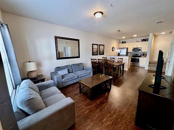 Discover this beautifully furnished and move-in ready 3-bedroom, 2-bathroom townhome—an ideal choice for short-term rentals, long-term leases, or personal residence. The primary suite, located on the first floor, features a spacious walk-in closet and dual vanities. Upstairs, two generously sized bedrooms share a well-appointed bathroom. The home showcases fresh paint and premium upgrades throughout, including granite countertops, modern kitchen and bathroom cabinetry, wood-look plank flooring in common areas, stainless steel appliances, a full-size washer and dryer. Located within a gated, resort-style community, residents enjoy exceptional amenities such as a fitness center, clubhouse, community pool and spa, business center, game room, paid EV charge station, and an on-site convenience store. Just minutes from Disney and other major attractions, this property offers unbeatable access to world-class entertainment, dining, and shopping.