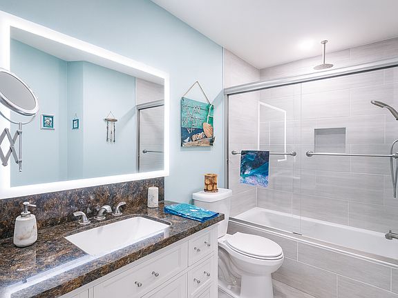 Inside, the open-concept layout features a well-equipped kitchen with bar seating that flows into the living room. Sliding glass doors open to a private patio, where you can relax and take in sweeping marina views.