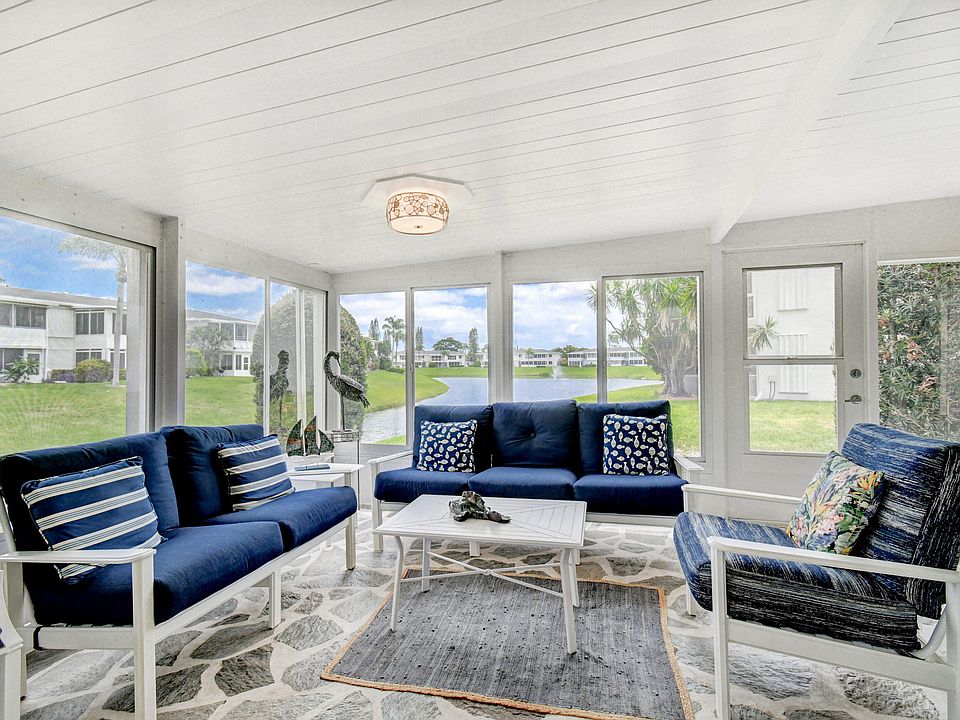 Don't miss out on a rare opportunity to own a first-floor corner condo with beautiful water views! This spacious unit features an expansive wrap-around screened patio, providing the perfect outdoor retreat for entertaining or relaxing with a good book. This condo has 2 large bedrooms and 2 bathrooms. It has a newer A/C, and the building features a brand-new roof. Assigned parking spot just outside the front door. Furniture is negotiable. Located in Pines of Delray West. This 55+ community is situated on a 35-acre property with a beautiful lake at the center. The community amenities include a clubhouse, a heated pool, a relaxing whirlpool, a large, shaded area by the pool, an exercise room, a library, a game room, and a community gathering space. Sports enthusiasts can enjoy bocce ball, pickleball, and tennis. The monthly condo fee includes water and sewer, cable and high-speed internet, and professional on-site management. The fee also covers roof repairs and maintenance, exterior painting, exterior cleaning, and common area lawn services.