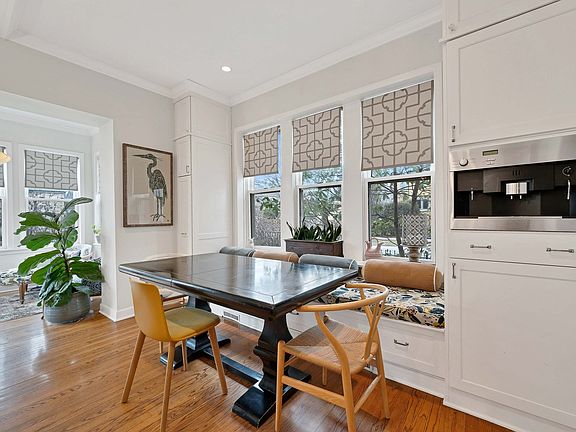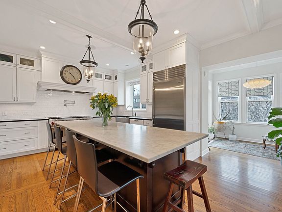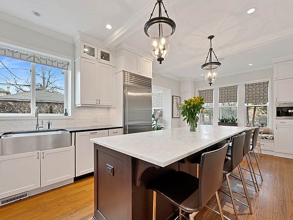 This elegant, all-brick 5-bedroom residence with 3 full and 1 half baths sits on an oversized double wide corner lot in the sought-after Ravenswood Manor neighborhood. Boasting a picturesque facade, the home welcomes you with a grand foyer overlooking the original staircase, setting the tone for the refined interior. The spacious living room, adorned with abundant windows and a striking stone fireplace, flows seamlessly into a sunlit reading nook or office space. The heart of the home, the updated eat-in kitchen, features custom white cabinetry complemented by white subway tile and sleek black quartz countertops. Equipped with top-of-the-line appliances, including a SubZero refrigerator, six-burner Wolf oven, and built-in Miele coffee maker, as well as an expansive island with breakfast bar seating, the kitchen is ideal for both casual dining and entertaining. Expanding the living space outdoors, the kitchen opens onto a deck, gated yard, and 2-car parking area. Upstairs, the upper-level houses four generously sized bedrooms, including a luxurious primary suite complete with an original ornate chandelier, a large walk-in closet, and a spa-inspired bathroom featuring Carrera marble and a spacious glass-mosaic shower. The lower level offers additional living space with a vast recreation room perfect for hosting gatherings or accommodating guests as an in-law suite. Completing the lower level are a bedroom, full bath, storage room, mechanicals, and laundry facilities. Conveniently situated near the Francisco Brown Line station, Horner Park, and an array of shopping and dining options along Montrose, Lawrence, and Kedzie, this unique home also provides easy access to the Kennedy Expressway.