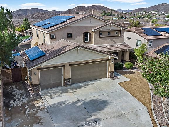 Beautiful 4-Bedroom Home with 33 Fully PAID-OFF Solar Panels in Desirable Canyon Heights. Welcome to this stunning two-story home, ideally located on a quiet cul-de-sac in the highly sought-after Canyon Heights community of Menifee. Offering 4 bedrooms, an additional main-floor bonus room that can easily serve as a 5th bedroom, 3 full bathrooms, and an upstairs loft, this spacious residence features 2,883 sq ft of well-designed living space on a generous 8,276 sq ft lot—perfect for both everyday comfort and entertaining. The heart of the home is the open-concept kitchen, complete with a large granite island, custom backsplash, abundant cabinetry, and ample prep space for the home chef. The inviting layout flows seamlessly into the adjacent living areas, creating an ideal environment for gatherings. The beautifully landscaped front yard enhances curb appeal, while the 3-car garage offers plenty of storage and parking options. One single-car bay has been thoughtfully enclosed for additional utility and includes a 240-volt EV charger—a valuable upgrade for electric vehicle owners. The backyard is spacious, flat, and private, featuring no rear neighbors and offering peaceful neighborhood views—an ideal outdoor setting for relaxation or future customization. Located within walking distance to Quail Valley Elementary School, this move-in ready home is ideal for families. Canyon Heights is a well-established community of just 394 homes, known for its low property taxes, quiet atmosphere, and strong sense of neighborhood pride. Don’t miss this rare opportunity to own an exceptional home with paid-off solar in one of Menifee’s most desirable communities!