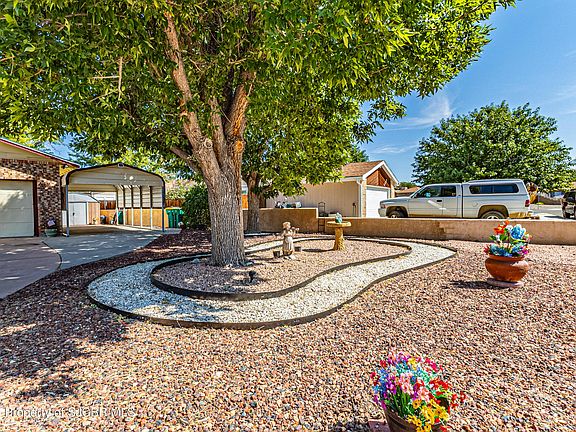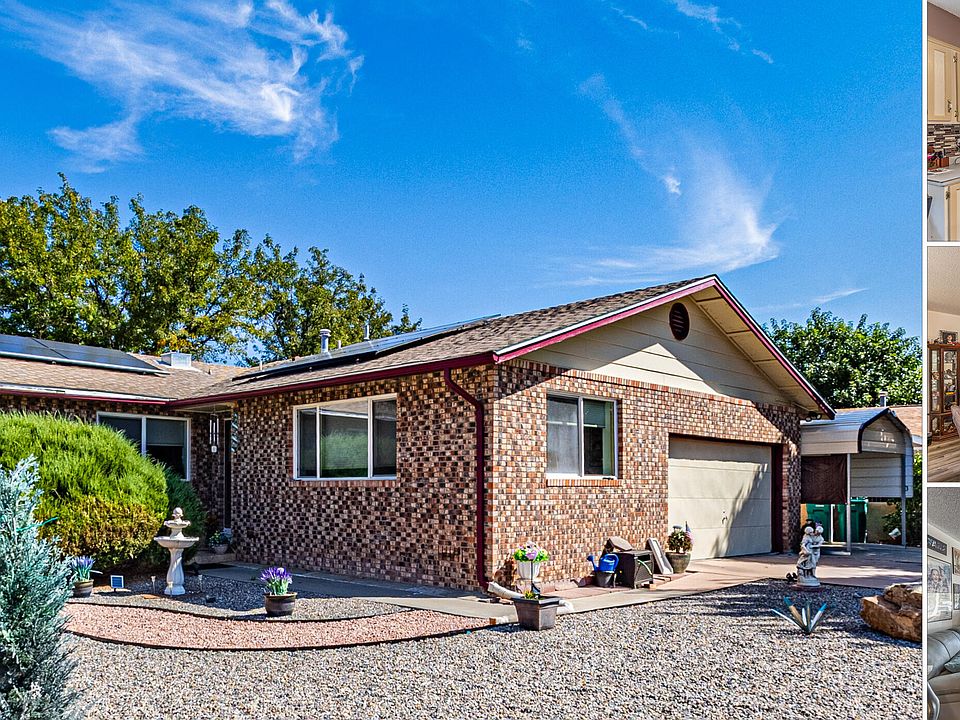 ''Palm Place'' Charming and well-maintained brick 3-bedroom, 2-bathroom home tucked away on a quiet cul-de-sac near river access in Farmington, NM--less than an hour from Durango, CO. Designed for easy living, the property features low-maintenance xeriscaping with mature shade trees and bushes. Inside, a welcoming foyer opens to a bright, open-concept living, dining, and kitchen area. The living room showcases a brick gas-log fireplace, ceiling fan, and French doors leading to a screened and covered back deck--perfect for indoor-outdoor living. The kitchen is equipped with a breakfast bar island, electric cooktop, raised oven, pantry, refrigerator with ice, reverse osmosis system, and a newer stainless-steel dishwasher. A chandelier-lit dining area provides an inviting space for meals and gatherings. The flexible floor plan includes a den/office that could easily be converted into a 4th bedroom. The primary suite offers comfort and functionality with a ceiling fan, dual closets, and an en suite bath featuring a tiled shower. Bedrooms two and three share a full bathroom with dual sinks and a tub. Additional highlights include a large laundry/mud room with cabinetry, a finished 2-car garage with storage and workbench, plus a 2-car carport ideal for a boat or RV. The property also features a shed, newer paint and flooring, water softener, and solar panels--buyers will assume the solar payments of only $135/mo with Federal Tax Credits available, which keep the monthly electric bill under $55/mo, even with HVAC use. This home blends charm, functionality, and efficiency, making it a rare find in a desirable location.