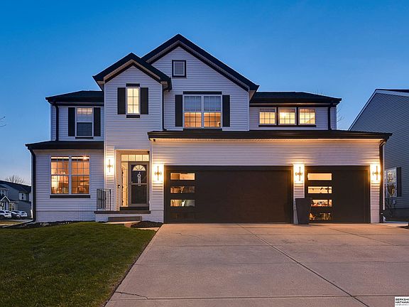 Stunning 2-story home,nestled in the highly sought-after Elkhorn School District. W/ 4 spacious bedrooms,4 bathrooms,& 2 dedicated office spaces, this home offers ample room for both relaxation and productivity.The exterior boasts impressive curb appeal,featuring brand-new vinyl siding, gutters, roof, and garage doors giving it a fresh,modern look. Step outside onto your private outdoor oasis, fully fenced for added privacy.Enjoy the tranquility of the covered patio,equipped with ambient lighting,a ceiling fan,& a grand fireplace that reaches the ceiling. Cozy up around the firepit & create lasting memories. Inside,the home is beautifully updated with new flooring, light fixtures, and fresh paint,offering a contemporary & inviting atmosphere throughout.The custom-designed primary bedroom closet provides an organized, luxurious touch.The basement is perfect for entertainment, featuring theatre system. The kitchen boasts white cabinets,stone backsplash,&quartz counters. AMA