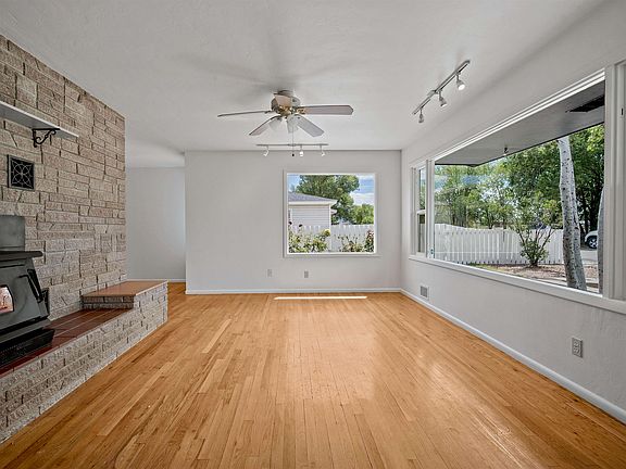 This spacious 3-bedroom, 2-bath ranch-style home offers comfort, character, and room to spread out. Inside, you'll find a generous kitchen, warm hardwood floors, and two cozy wood-burning stoves—one in the living room and one in the family room—perfect for chilly evenings. The large laundry/utility room adds extra convenience, while ceiling fans throughout keep things cool. Enjoy alley access to an oversized 2-car detached garage plus a 17x12 workshop—ideal for hobbies, lawn care tools, or even a small art studio. Fresh interior and exterior paint, a brand-new roof, and a fully fenced backyard with irrigation water make this home move-in ready. Located in a quiet, friendly neighborhood and easy to show—schedule your tour today!