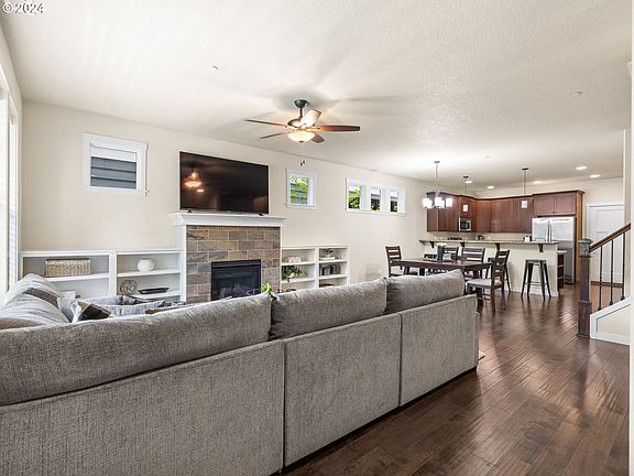 Welcome to this meticulously maintained, move-in-ready gem, perfectly situated in Villebois, just steps away from the Piazza, farmer's market, food trucks, and a vibrant array of events, parks, and trails. As you step onto the inviting covered front porch, you'll be greeted by an open-concept main level designed for both relaxation and entertaining. The living room is a focal point with its elegant built-ins and cozy gas fireplace, seamlessly connecting to the well-appointed dining area and stunning kitchen. The kitchen is a chef's dream, featuring an eat bar, ample warm cabinetry, a pantry, gleaming stainless steel appliances, and a gas range. Sliding doors from the kitchen open to your private outdoor oasis, complete with a spacious covered patio—perfect for alfresco dining and relaxation. On the second level, the primary suite offers a serene retreat with its own private balcony, a luxurious soaking tub, and a generous walk-in closet. Two additional spacious bedrooms, a full bathroom, and a conveniently located laundry room complete this level. The third level boasts a large family room ideal for movie nights or entertaining, plus an additional bedroom and bathroom—offering plenty of flexibility and space for all your needs. Don’t miss the chance to call this exceptional property your new home!