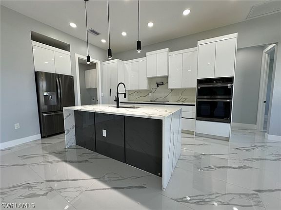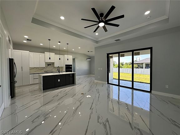 NEW CONSTRUCTION! MOVE IN READY! Welcome to this custom built home in SW Lehigh Acres boasting 4BR, 2BA and plenty of space for a pool. The owner did not fall short adding all the latest features and details to this build. The kitchen offers elegant quartz countertops with a water fall island, laminate real wood cabinets, LG black stainless steel appliances and 24x48 beautiful porcelain tile throughout. It's also secured with Hurricane impact ECO windows, exterior doors and 8ft triple sliding allowing lots of natural light in. Both bathrooms feature quartz countertops placed on floating custom vanities and tiled showers with glass doors. Mater bedroom offers his and hers walk-in closets with wood shelving, an XL walk-in shower and a double slider leading out to back lanai. One unique factor about this model is the high ceilings, ample recess lighting with treys and crown molding in the living room and master BR. Located in one of the most sought after areas in Lehigh Acres where it is peaceful, quiet and just minutes away from SR.82, stores, shops, fire department, parks and schools. Schedule your showing today to see this beautiful home!