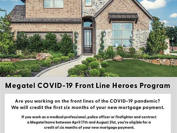 ASK ABOUT THE MEGATEL COVID-19 FRONT LINE HEROES PROGRAM. ARE YOU WORKING ON THE FRONT LINES OF THE COVID-19 PANDEMIC AS A MEDICAL PROFESSIONAL OR FIRST RESPONDER? IF SO, MEGATEL HOMES WILL CREDIT THE FIRST 6 MONTHS OF YOUR NEW MORTGAGE PAYMENTS AS A THANK YOU! SEE YOUR COMMUNITY SALES CONSULTANT FOR FULL DETAILS. Sales contract and the Front Line Heroes Addendum must be signed between April 17 and August 31, 2020. Subject to lender approval. Mortgage payment refers to principal and interest only. Additional restrictions apply. Megatel Homes reserves the right to change or cancel the program at any time.
