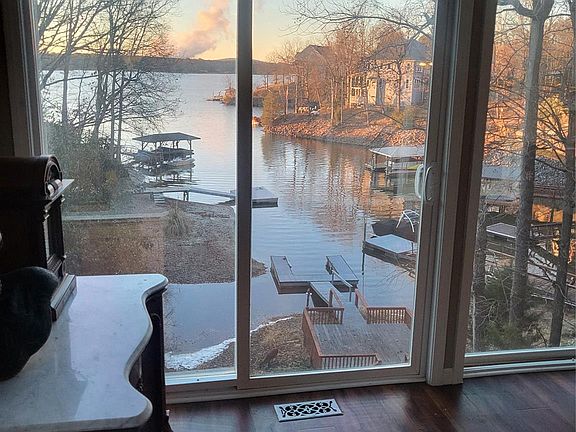 Dock and beach, 4 bedroom/3 bath..2 bedrooms are master suites, 3 living rooms with full main channel views. One has a pine cathedral ceiling with a floor to ceiling stone fireplace. The second has a cathedral ceiling and the third has a tray ceiling. All have full lake views as does the main floor master bedroom. There is a deck on the lake and a full length deck on the lower level. The upper level deck has the place for a sunken hot tub. There is a two car garage and an office.