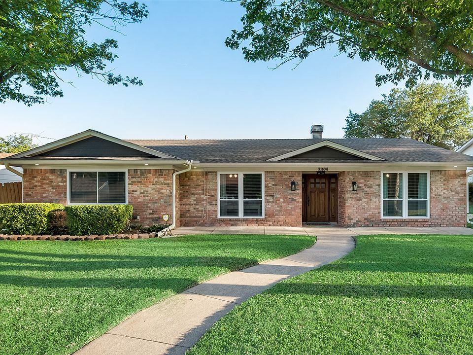 Beautiful 3 bedroom, 2 bath, 2 car garage home in the Woodlawn Park subdivision of Mesquite. Nicely remodeled and updated with designer paint and custom fixtures. HVAC system replaced in 2020; windows replaced in 2022, gutters installed in 2022. Large family room and extra flex room that can be used as formal living, office, or other room. Formal dining and breakfast area. Updated kitchen with granite countertops and stainless steel appliances with gas cooktop. Large back yard with covered patio. Other items upgraded include exterior lighting, exterior paint, gas stove, new garage door, Craftsman wifi enabled garage door opener, and many more upgrades. Garage has separate heating and AC. Close to park and walking trails.