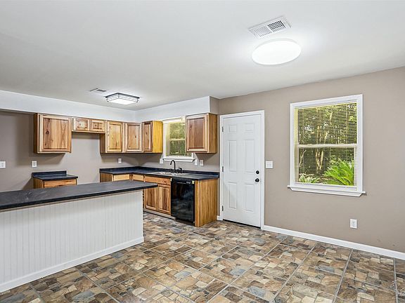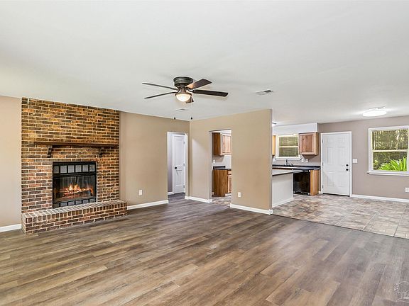 Move-in ready home featuring a spacious great room with brick fireplace and open floor plan. Eat-in kitchen with new cabinets, countertops, and fixtures, opening to a peaceful backyard with beautiful, wooded views. Split floor plan offers a large primary suite with two closets and an ensuite bath with double vanity. Recent upgrades (2024): New roof, New HVAC system, New LVP flooring, Fresh interior paint ** Additional features include a 2-car garage and convenient location just off Blue Angel Parkway. Approx. 18 minutes to downtown Pensacola and 26 minutes to Perdido Beach.