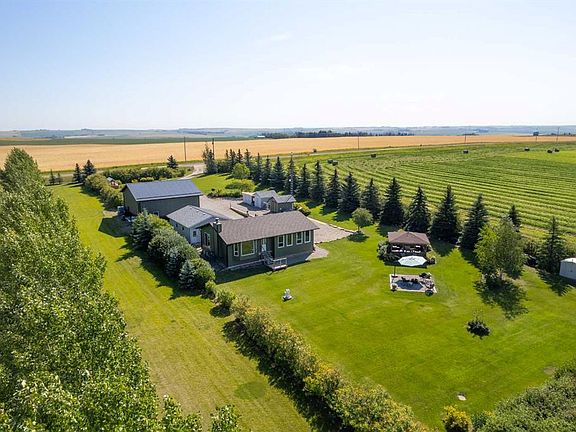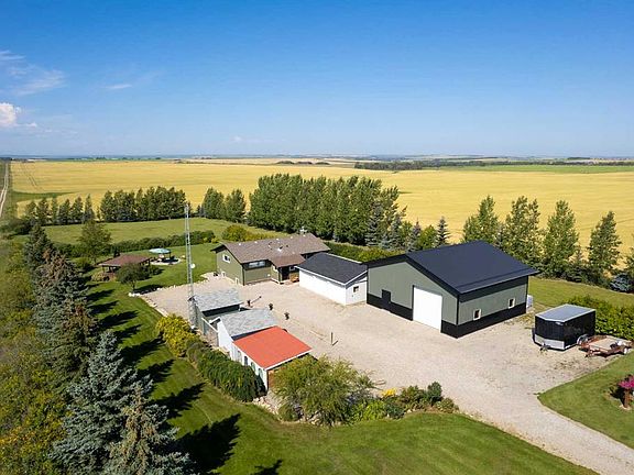 Discover this stunning acreage west of Carstairs/Crossfield with breathtaking MOUNTAIN VIEWS, where modern updates meet timeless charm. Built in 1961 and thoughtfully relocated onto a brand-new ICF foundation in 2021, this property boasts a bright, inviting interior filled with NATURAL LIGHT—highlighted by a modern white kitchen with ample counter space and an EAT-UP BAR, a spacious living room with a cozy electric fireplace and large windows(new windows) framing the scenic views, and a dining area with a patio door. The main floor has been BEAUTIFULLY RENOVATED, including a fresh bathroom with a double shower and tub in 2025, and offers two sizable bedrooms one with numerous windows & one with extra closet space, along with a versatile OFFICE/HOBBY ROOM. Downstairs, you'll find 9-foot ceilings, IN-FLOOR HEAT, a fun 3-piece bathroom, and laundry area, all designed for comfort. Outside, enjoy newer HARDIE BOARD SIDING, a new roof on the insulated and HEATED DETACHED TRIPLE GARAGE, a large 36x40 SHOP with a gravel floor, and a meticulously MANICURED YARD featuring MATURE TREE SHELTERBELTS, vibrant perennial beds, a GAZEBO, and a backup generator. This property combines spacious, modern living with exceptional curb appeal, one of the best mountain views and privacy—truly one of the nicest yards in the area & great location with easy access to Cochrane/Calgary/Hwy 2. ** Check out the Virtual tour link of this stunning property **