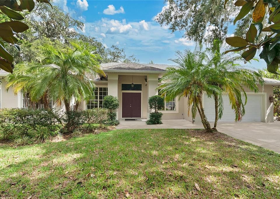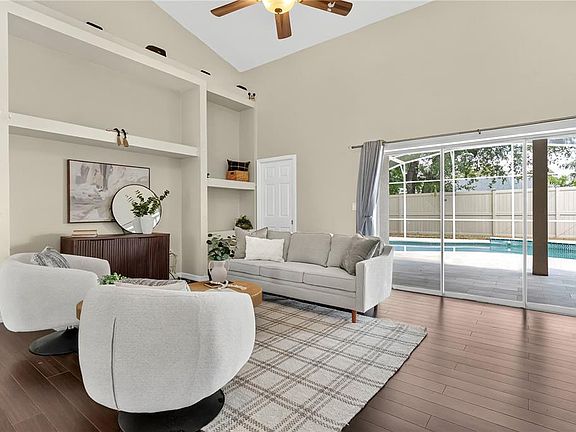 Single story pool home built for easy Florida living on a quiet cul de sac. Step into vaulted ceilings and an open concept great room that flows straight to the screened lanai and solar heated pool. The white kitchen has granite counters, a mosaic backsplash, and opens to formal dining and a sunny breakfast nook for slow mornings or last minute dinner with friends. Primary suite is a private retreat with patio access, a walk in closet, and an en suite with dual sinks, soaking tub, and separate shower. Three more bedrooms share an updated hall bath on the opposite side so everyone gets space. Inside laundry with utility sink and storage keeps life simple. Fully fenced backyard adds privacy with a patio pad ready for the grill. Work from home win. The home has fiber optic internet connected for fast and stable video calls and file uploads. A security system is in place for peace of mind whether you are home or away. It is even better in person. Watch the drone fly through for the full vibe, then ask for a tour this week.