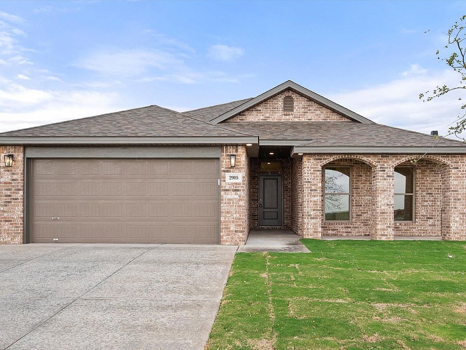 Buy NOW and get up to $10,000 Use-It-Your-Way Cash! This beautiful home features a brick exterior with double columns and stone accents framing the covered front porch. Inside, luxury vinyl plank flooring flows through the open-concept kitchen, living, and dining areas. The kitchen includes granite or quartz countertops, a spacious peninsula with bar seating, stainless steel appliances, and a large enclosed pantry. The cozy living room boasts a corner brick fireplace. The secluded master suite offers a drop-in tub, walk-in shower, his and hers vanities, and a walk-in closet with utility room access. Enjoy the outdoors on the covered back patio. Premium fixtures complete this elegant home.