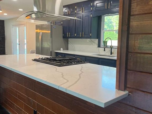 Hardwood floorFenced in backyardOversized deckQuartz countertopBeautifully designed kitchen islandTiled floor
