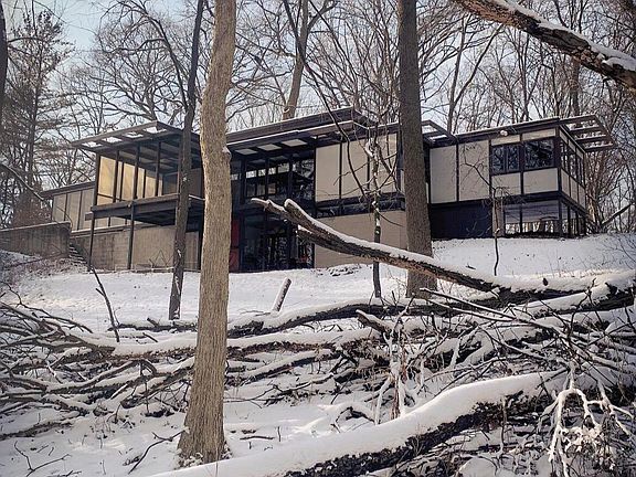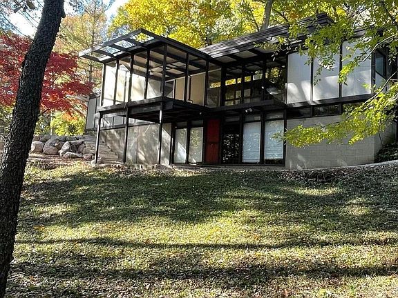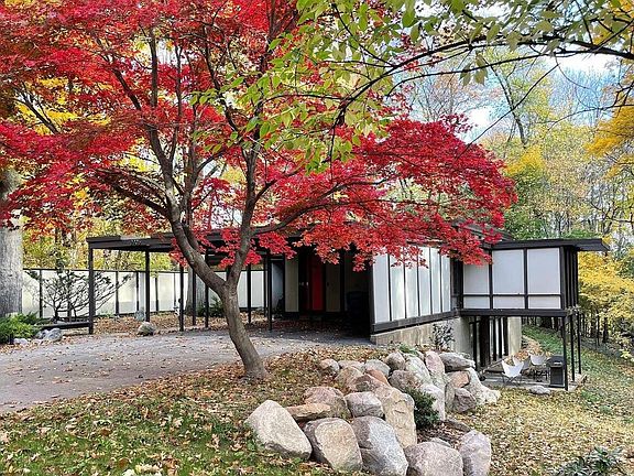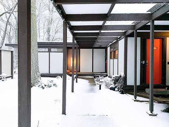 Open Sunday Aug 6th 12 - 2 pm. This 1959 mid century modern home was an Architectural Record home of the year. From the Zen Garden entry to the pinwheel floorpan, architect Norman Carver combines light and space to create a peaceful atmosphere and beautiful views of the 1.42 acre wooded cul-de-sac lot. The great room's clerestory windows illuminate the formal dining area and living room centered around a copper accented fireplace. A custom kitchen, screened porch, office, primary bedroom with full windowed wall and large built-in closets, 2nd bedroom and full bath complete the main floor. The walkout level delivers a large rec room, 3rd bedroom, 2nd full bath and flex room. Current owners have done significant restoration work and literally wrote the book on the architect in 2019.