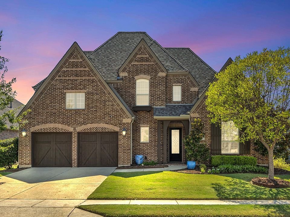 Bathed in natural light and full of charm, this breathtaking North-facing Highland Home is nestled in the prestigious Mustang Lakes community—one of DFW’s most desirable neighborhoods. Perfectly positioned on a beautifully landscaped lot, this one-owner home offers stunning curb appeal, luxury upgrades, and a thoughtful floor plan designed for today’s lifestyle. Inside, discover 4 spacious bedrooms, 3.5 baths, and a 3-car tandem garage—ideal for parking a golf cart, collector car, or creating a workshop. Elegant wood flooring, architectural details, and smart home features enhance the home’s modern style and functionality. The layout is designed for flexibility: First floor: A grand living area with soaring ceilings, formal dining room, and private home office with hardwood floors. The oversized owner’s suite is a true retreat with spa-like amenities, dual vanities, a huge walk-in shower, and an irresistible closet with abundant storage. A downstairs media room sets the stage for movie nights, while a secondary en-suite bedroom with full bath is perfect for guests or multi-generational living. Upstairs: A spacious game room with a large walk-in closet that can easily be converted into an additional full bathroom, plus two additional bedrooms with a Jack-and-Jill bath. A flex space at the end of the game room provides the perfect spot for homework, crafts, or play. The chef’s kitchen is an entertainer’s dream—featuring a 6-burner gas cooktop with professional vent hood, double ovens, two-toned granite countertops, stainless steel appliances, white cabinetry, and a massive island that opens seamlessly to the breakfast nook (with built-in seating and storage), dining, and living areas. A laundry room with sink, drip-dry area, and cabinets adds everyday convenience. Step outside to enjoy the large grassy backyard, ready for your dream outdoor living space, pool, or garden retreat. An extended covered patio makes entertaining easy.